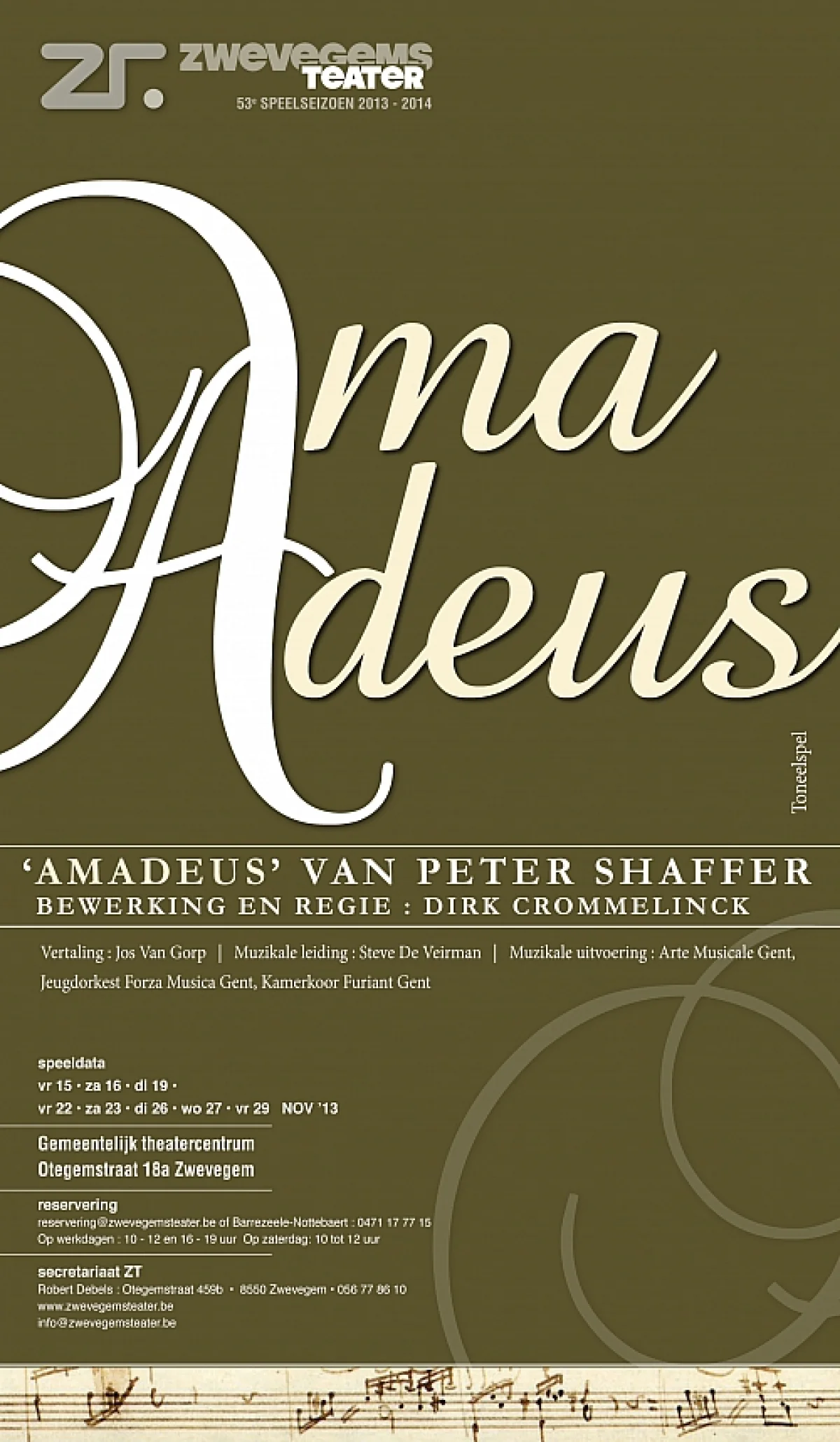 Peter Shaffer geeft zijn publiek een wel heel interessante visie op het wonderkind Wolfgang Amadeus Mozart, want hij laat ons kijken door de ogen van de jaloerse hofcomponist Antonio Salieri. Die heeft een pact gesloten met God. In ruil voor een schitterende muzikale carrière zal hij Hem eeuwig dienen. Tot zijn verbijstering merkt Salieri dat een 'vulgair creatuur' als Mozart, heel wat meer talent heeft dan hijzelf. Salieri kan zijn verbittering niet verbergen. Afgunst verteert hem. Hij voelt zich bedrogen en besluit zich , via Mozart, te wreken op de God die hem zo bedrogen heeft. Met live muziek en zang!