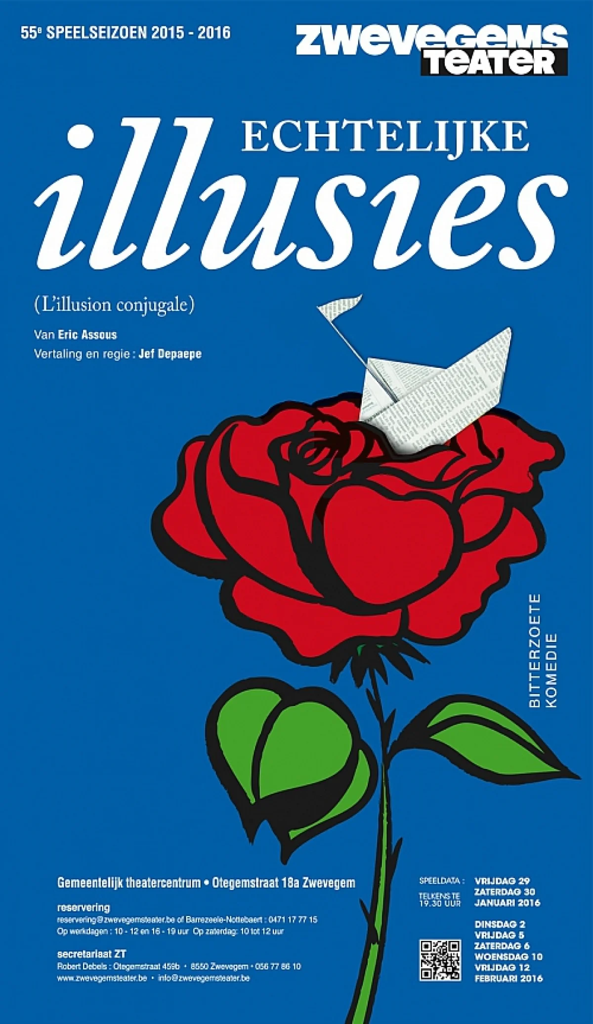 Met de bitterzoete komedie “Echtelijke illusies” verruimt Eric Assous het klassieke maar eeuwig jonge thema van de man-vrouwrelatie (binnen het huwelijk) met een vrij brutale variante. Jeanne en Maxime zijn al jaren getrouwd, en dat huwelijk is, op grond van beider wijsheid en respect voor elkaar, duurzaam en stabiel. Kortom, ze zijn gelukkig. Tot nieuwsgierigheid de kop opsteekt… Op een dag vindt Jeanne het tijd voor een ‘stand van zaken’: “Ge zegt mij hoeveel affaires ge tijdens ons huwelijk hebt gehad, en ik doe hetzelfde… Ge geeft mij een getal, ik geef u een getal. Maar geen namen!” Een heikele vraag, die de bonafide maar oeverloos jaloerse echtgenoot niet alleen in verlegenheid brengt, maar ook furieus maakt. Wat volgt is een grappig, intelligent spel van aanval en verdediging, dat een verrassende wending krijgt, als vriend Claude dit delicate scenario binnenstapt. Er bestaat geen leugen zonder gevolg, geen waarheid zonder gevaar. Wat blijft er uiteindelijk over van Maxime’s vriendschap voor Claude? En van zijn huwelijk? Heeft Oscar Wilde dan toch gelijk, als hij stelt dat een gelukkig huwelijk uit meer dan twee personen bestaat? De Franse toneelauteur Eric Assous, die als geen ander met spanning, humor en verbale steekspelen het publiek kan amuseren, won met dit stuk de Molière 2010 voor de beste auteur. Het Zwevegems Teater brengt de creatie voor Vlaanderen en Nederland.