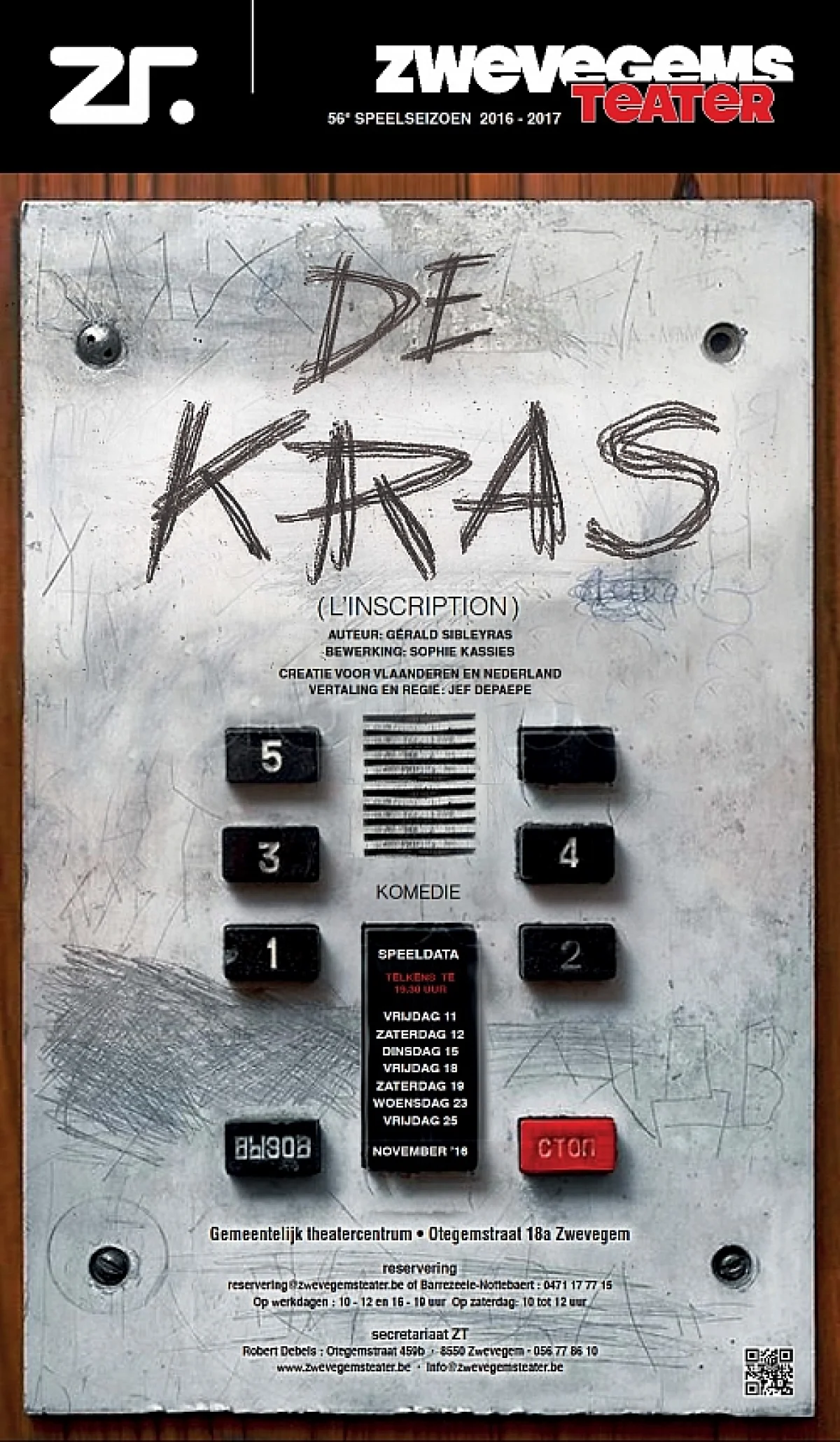 Mijnheer Deconinck is samen met zijn vrouw Valerie net verhuisd naar een appartementsgebouw met standing, dichter bij zijn werk. Maar amper een week later heeft één of andere “mysterieuze vijand” een voor hem uiterst compromitterende slogan in de lift gekrast. Mijnheer Deconinck zoekt zijn buren op om uit te vissen wie nu zoiets zou kunnen gedaan hebben: meteen de aanleiding om vast te stellen dat ze gemener zijn dan ze er uitzien. En toch nodigt hij hen prompt uit op een aperitief... Met de komedie “De kras” brengen we opnieuw een creatie voor Vlaanderen en Nederland. Van dezelfde auteur produceerde het ZT in februari 2015 "Wind in de populieren".