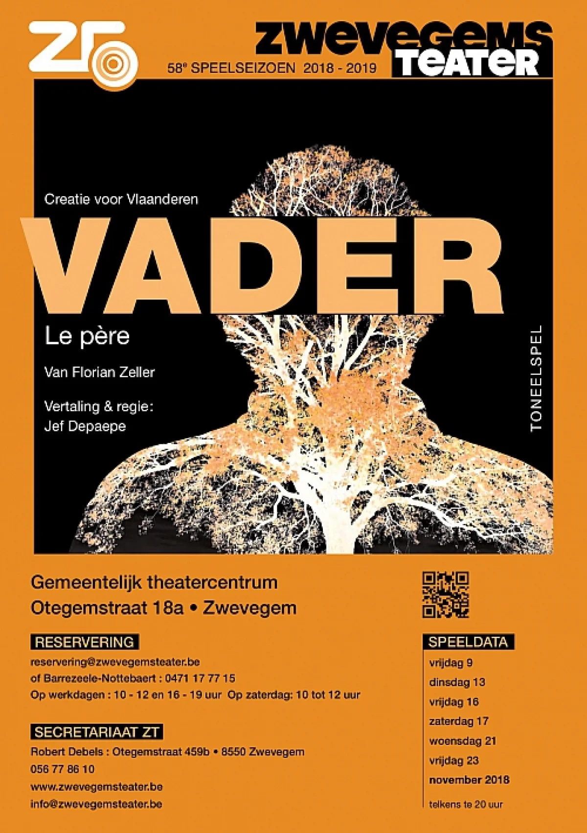 Vader is een ontroerend stuk over een oude man die aan Alzheimer lijdt. André, tachtig, weduwnaar, vader van twee dochters, merkt dat er iets aan het veranderen is: dingen verdwijnen, of hij verstopt ze, hij voelt zich bedreigd, achtervolgd, hij verliest zijn chronologische en ruimtelijke oriëntering. Alsof hij in zijn geheugen kleine gaatjes heeft… Hij woont nog alleen in zijn appartement, en doet tegenover zijn oudste dochter alsof er geen vuiltje aan de lucht is. Al is het duidelijk dat hij het stilaan alleen niet meer aan kan. Daarom zorgt ze voor de nodige familiale hulp, wat haar door haar trotse en zijn waardigheid opeisende vader niet in dank afgenomen wordt. Net nu ze met haar nieuwe partner in Londen wil gaan wonen. Wat doen? Hoe moet ze zoiets aanpakken? Een verrassend stuk, vreemd, komisch ook, maar genadeloos: een oude man op zoek naar zichzelf in een wereld waarin zijn biografie en de relaties die ze met zich meebracht, niet meer gelden, omdat die wereld, waarin ze ontstaan zijn, langzaam aan het uitdoven is.