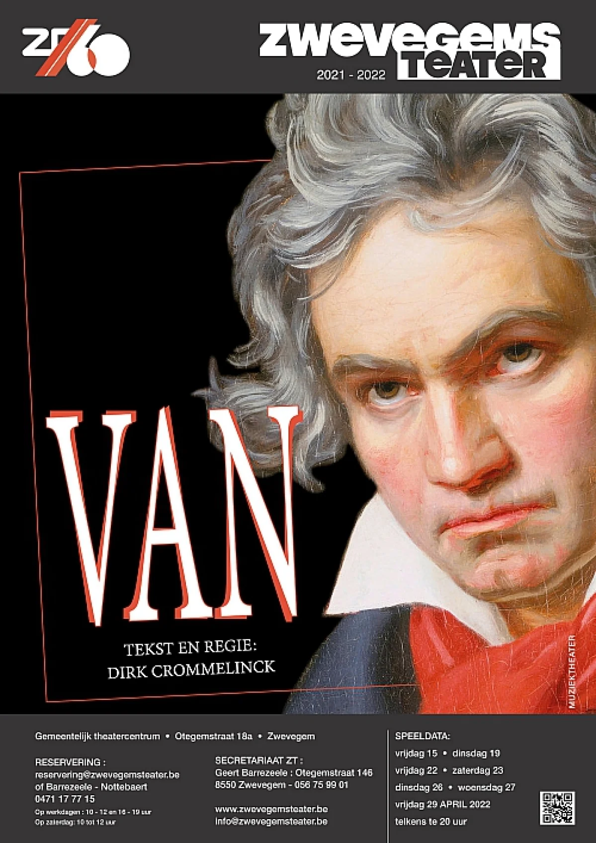 Mysterieuze korte titel voor een theatrale uitsmijter van jewelste. Na Amadeus (Zwevegem, 2013) brengen uw Zwevegems Teater, Arte Musicale Gent en Theater de WAANzin Gent in een coproductie over provinciegrenzen heen het mysterieuze leven van één van de grote klassieke componisten uit de wereldgeschiedenis op het toneel: Ludwig VAN Beethoven. Gebaseerd op een aantal non-fictiebronnen en gelardeerd met fictionele zijsprongetjes leren we u zijn fascinerende leven en werk kennen. Zijn trauma’s, zijn composities, zijn familieleven, zijn esbattementen met de vrouwen, zijn lastig innerlijk afzien, zijn vrijgevochtenheid, het gevecht met zijn toenemende doofheid en zijn bewogen relatie met zijn vader. Het komt allemaal aan bod in een nagelnieuwe tekst, doorweven met Beethovens schitterende muzikale werk, live op het toneel.