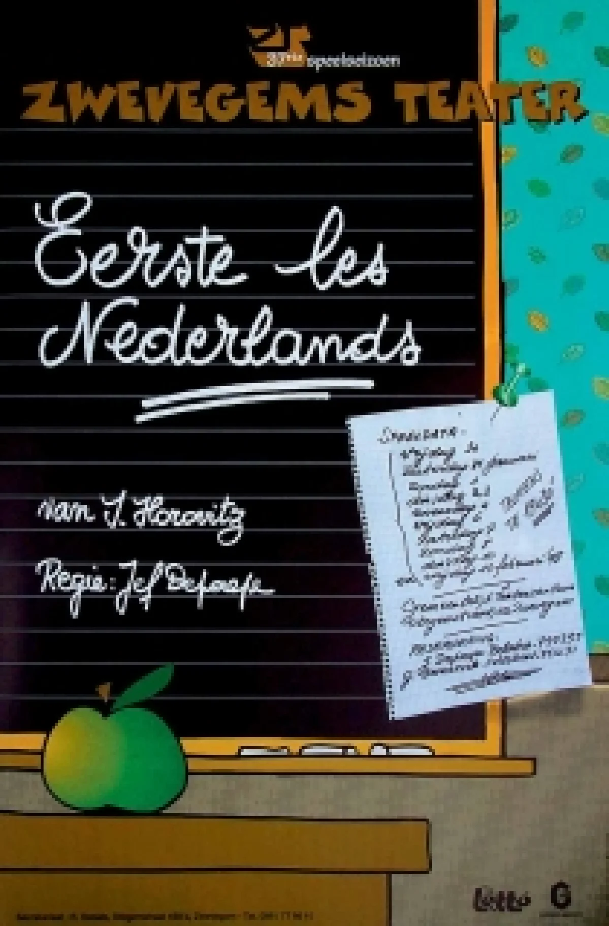 "Eerste les Nederlands" (1975) van Israel Horovitz is een leuke komedie, die volledig steunt op het mekaar "niet" begrijpen. Een onervaren schooljuf krijgt de opdracht een groep anderstaligen Nederlands bij te brengen. De klas blijkt echter te bestaan uit volstrekt Nederlandsonkundigen. De Italiaan spreekt alleen maar Italiaans en begrijpt geen enkele andere taal. De Fransman is zeer sterk in de taal van Molière en daarmee uit. En wat zou de Amerikaan dan wel anders spreken dan Engels? De Spaanse begrijpt ook al geen andere taal, net als de Portugese. En de Pool? Soms begrijp je niet, dat hij zichzelf begrijpt. Geef daar maar eens les aan. Dat deze Babylonische toestand leidt tot erg komische situaties, ligt voor de hand. Voor het publiek een heel ontspannende avond, voor de acteurs en actrices een enorm zware opgave. "Primary English Class" werd in New York gecreëerd met Dina Keaton in de hoofdrol en is het stuk dat in Canada het langst heeft gelopen ooit. Een primeur voor het amateurtheater.
