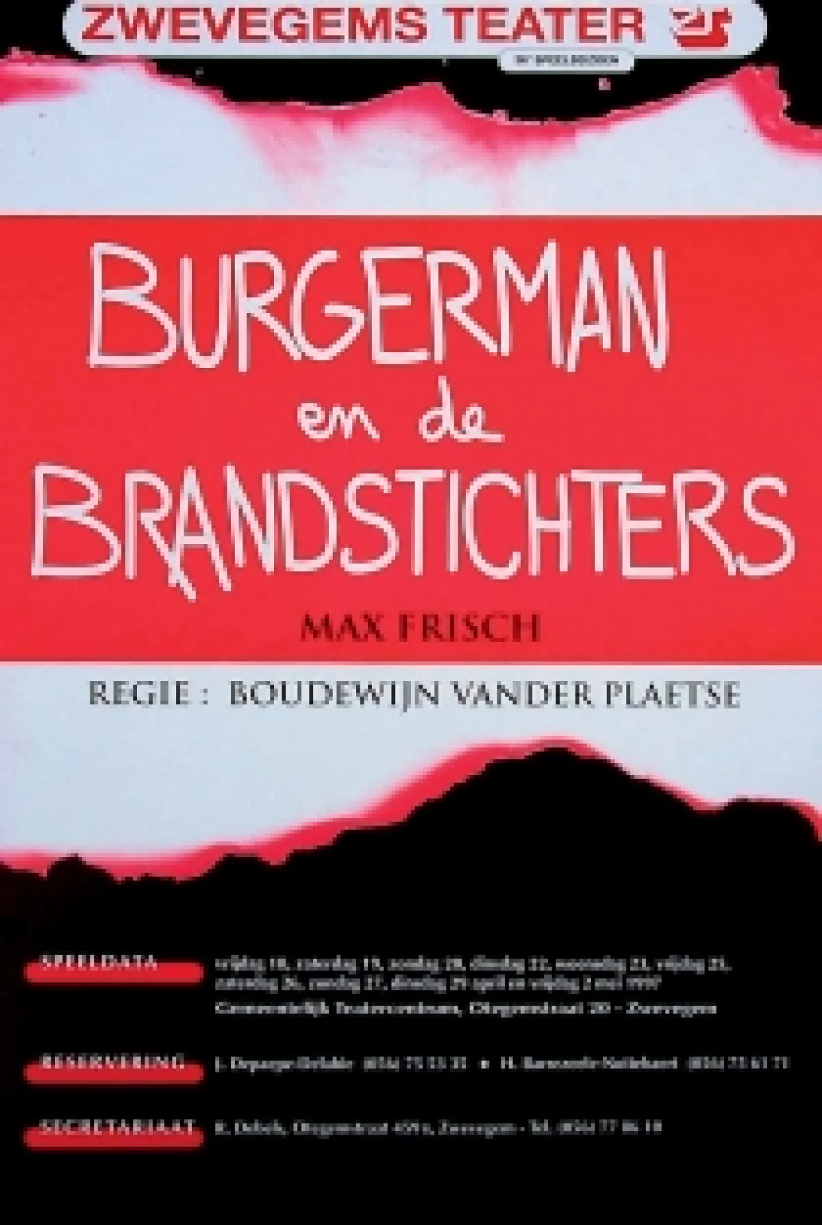 De Zwitserse toneelschrijver Max Frisch, die een belangrijke plaats bekleedt in het Europees toneel na de tweede wereldoorlog, heeft zijn naam vooral te danken aan "Biedermann und die Brandstifter". De auteur noemt het stuk "een moraliteit zonder moraal" en vertelt een eenvoudig verhaal, waarvan de diepere betekenis voor iedere toeschouwer duidelijk is. Biedermann (= de welgestelde burger) krijgt het bezoek van een worstelaar die hem bang maakt en onderdak afdwingt voor zichzelf en een kameraad. In de stad zijn er brandstichters aan het werk en Burgerman en zijn vrouw vrezen dat ze de daders in huis gehaald hebben. In plaats van een einde te maken aan de situatie geven ze de twee logés uit angst nog meer faciliteiten. Zelfs nadat Burgerman vaten benzine op de logeerkamer ontdekt heeft, durft hij niet ingrijpen. Dat het onvermijdelijke zal gebeuren, is reeds van in het begin duidelijk. "Burgerman en de Brandstichters" is geen realistisch stuk, maar toont op Brechtiaanse wijze hoe een bepaalde politieke ideologie de burger in haar greep krijgt. Het stuk dateert van 1956 maar laat op een ironische manier (de grijnslach is constant aanwezig) zien dat het zelfs in het Vlaanderen van vandaag actueel is.