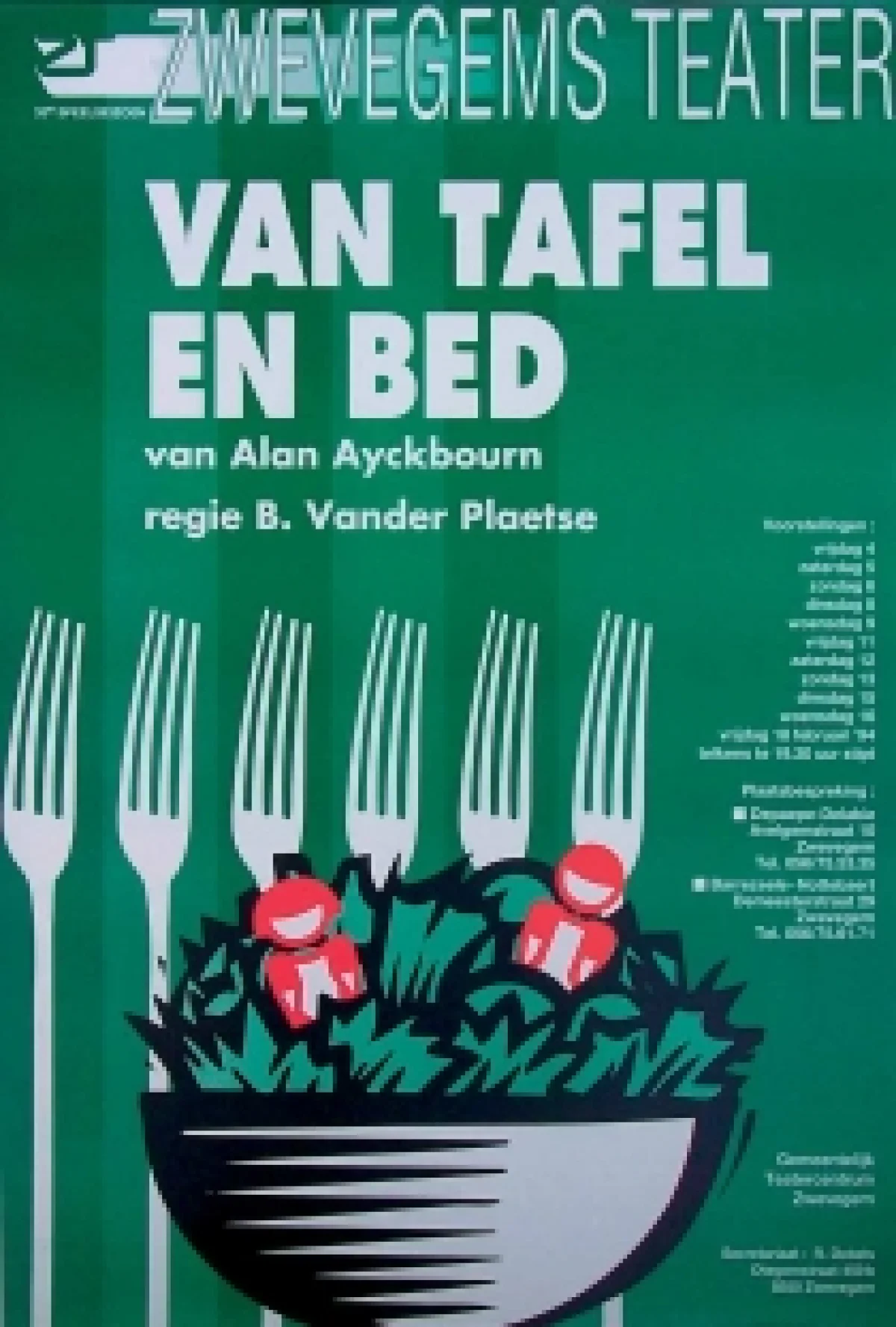 Alan Ayckbourn is geen onbekende voor het publiek van het ZT: het is de vierde maal dat een stuk van deze meest gespeelde moderne, Engelse komedieschrijver op het programma staat. Onder de titel "Willem de Veroveraar" (1974) schreef Ayckbourn drie avondvullende stukken die samen een bijzonder ingenieus geheel vormen, maar ook afzonderlijk kunnen gespeeld worden. Ze behandelen – elk op een afzonderlijke locatie – de voorvallen in een familie gedurende een weekend. "Van tafel en bed" is het eerste stuk van de trilogie "Willem de Veroveraar" en speelt in de eetkamer. Ergens op het platteland zorgt de jongste zuster in het ouderlijk huis al jaren voor haar bedlegerige moeder en probeert ze ook een relatie aan te gaan met een vrijgezel en al te toegewijd veearts. Haar familieleden die ze enkel met Kerstmis ziet, heeft ze gevraagd om voor een weekend op moeder te passen. Voor één keer wil ze er enkele dagen uit zijn, maar met wie? Zoals meestal bij Ayckbourn raken de menselijke relaties in de war, zonder dat iemand er eigenlijk schuld aan heeft. "Van tafel en bed" heeft veel prijzen weggekaapt omdat de auteur zich hier op zijn best toont in het observeren van de kleine kantjes van het menselijk ras: dagdagelijkse mensen van onze tijd in tragikomische situaties. Je zou er de hele tijd hartelijk mee lachen als het niet zo zielig en melancholisch was!