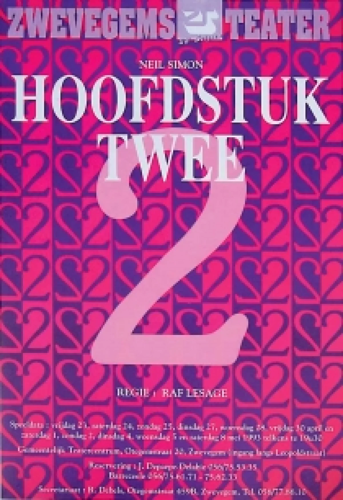 Als je één stuk tragikomisch kan noemen, dan zeker dit "Hoofdstuk Twee", dat een haast magische mengeling presenteert van broze melancholie, diep menselijke tragiek en een bijzonder gevatte, spitse en geestige dialoog, zoals alleen Neil Simon die kan bedenken. Voeg daar nog de bijzonder warme, rake en genuanceerde tekening van de levensechte personages aan toe en je hebt meteen een schitterende toneel-cocktail. Joris Pieters heeft na twaalf gelukkige jaren zijn vrouw verloren. Barbara was een "wonder van een vrouw", onvoorspelbaar, creatief, altijd goed voor nieuwe wegen, gevat, intelligent, knap… Haar dood heeft Joris een ferme opdonder gegeven, die hij maar niet te boven schijnt te komen. Hij sluit zich op, weigert te eten, is totaal onverschillig geworden voor deze wereld en wat hij hem nog verder zou te bieden hebben. Zijn veel frivoler broertje, altijd al de losbol van de familie, de oppervlakkige levensgenieter reageert dom en impulsief als hij is, totaal verkeerd op deze houding en probeert Joris met overdreven en misplaatste ijver in contact te brengen met mogelijke kandidaten voor een tweede hoofdstuk. Dat zorgt voor de nodige misverstanden maar meteen ook voor verrassende zelfanalyse bij het broederpaar, dat in menig opzicht doet denken aan het vreemde stel dat Simon op het toneel bracht in "The Odd Couple". Leo weet van geen ophouden en zet zijn zoektocht naar de ware Barbara verder. Hij meent haar gevonden te hebben in Annie, de vriendin van één van zijn liefjes. Als dan inderdaad Joris meer dan gewone belangstelling laat blijken voor Annie en zelfs besluit met haar te trouwen, wil Leo zijn broer toch even aan zijn verleden herinneren. Joris twijfelt aan zichzelf, aan de opportuniteit en de kans op slagen van een nieuwe relatie, aan een leven na Barbara. Deze komedie-met-een-hart ontroert en amuseert en verschalkt het publiek met de aanstekelijke, gevatte en bij wijlen pikante humor waarvan Neil Simon (Blootsvoets in het Park, Een Raar Koppel, De Laatste van de Echte Minnaars, Lieve God ze draaien me dol) zijn handelsmerk heeft gemaakt. Ongetwijfeld van het beste dat deze succesvolle Amerikaanse auteur ooit schreef. Schateren zit er zelden in, grim- en glimlachen des te meer, mild gniffelen van begin tot einde. Geen wereldschokkende toneelervaring dus, maar een gezellige en warme komedie die van regisseur en acteurs heel wat vaardigheid vereist. Aan het publiek om uit te maken of het Zwevegems Teater daarin slaagt.
