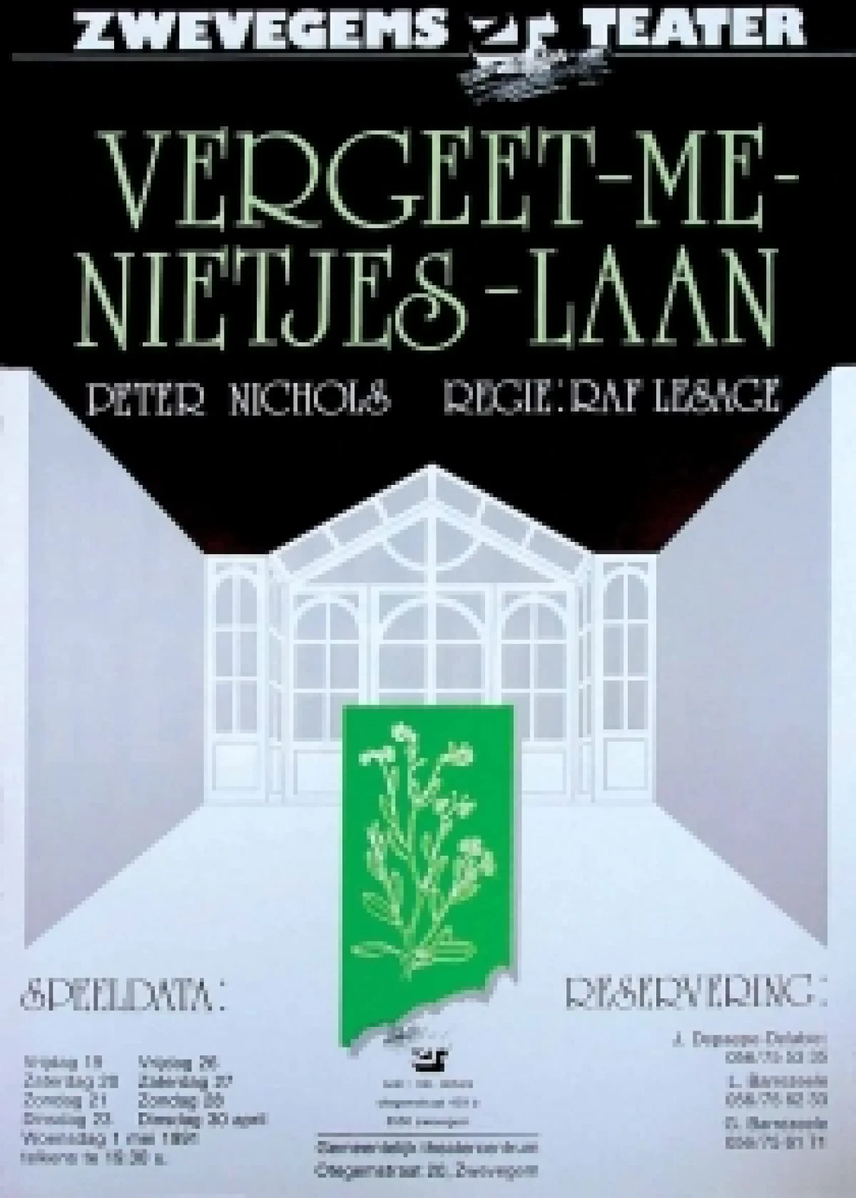 Het stuk, dat in 1971 in première ging, behandelt op subtiele en originele manier het oerklassieke thema van het generatieconflict. Een nu veertigjarige zoon groeide op tijdens de turbulente laatste jaren van de tweede wereldoorlog. Niet direct de meest geschikte tijd voor een jonge man om zijn adolescentie te beleven. Zijn vader was een krenterige handelsreiziger met een ergerlijke kruideniersmentaliteit en een karakter waarmee opgroeiende kinderen het niet bepaald gemakkelijk hebben. Bovendien etaleert hij een stel kleurige eigenaardigheden die een onmisbaar effect hebben op de zoon. Dit centrale thema heeft bovendien ook een nefaste invloed op de gezinsrelaties van de zoon: zijn eerste huwelijk liep spaak en zijn huidige relatie hapert. Seksuele frustraties, gegroeid tijdens een bedwongen adolescentie zijn daar niet vreemd aan. Nichols benadert deze thematiek met een groot medeleven en een directe betrokkenheid. Zijn minutieuze observatie van het gezinsleven en van de absurditeiten die zich in de oorlogsdagen manifesteerden zorgt voor permanente hilariteit; de glimlach van de herkenning. Dat en de ragfijne psychologische tekening van de personages maken van "Vergeet-me-nietjes-laan" een bijzonder genietbaar toneelgebeuren.