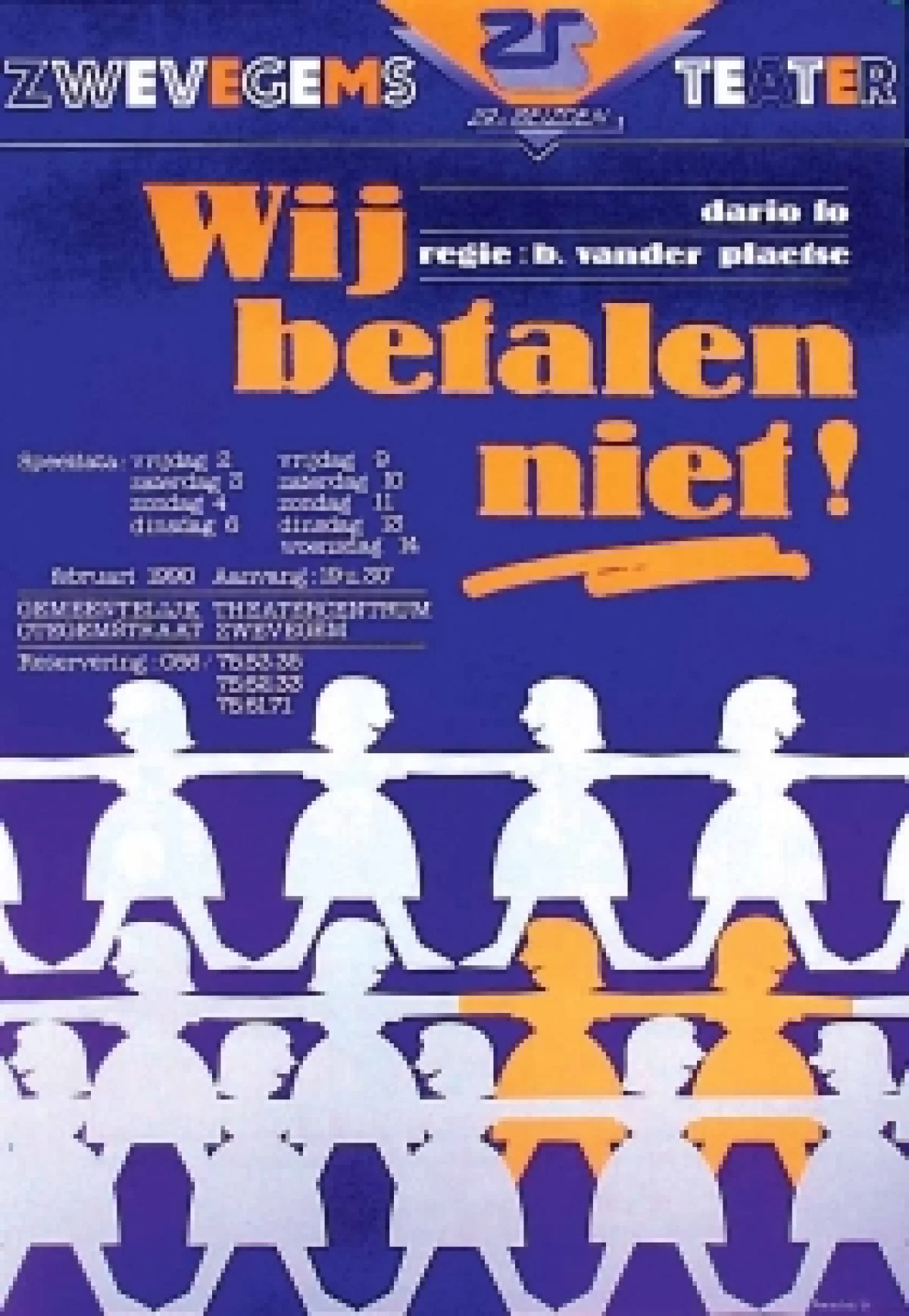 Dario Fo voorstellen aan het Zwevegems publiek wordt zo stilaan overbodig. Na 'Toevallige dood van een anarchist' (waarmee het ZT het Landjuweel won) en 'Verhalen rond Christus' (waarvan Eugène Delabie meer dan 70 voorstellingen gaf tot in Zaïre toe), presenteert het ZT nu een derde stuk van deze bekende hedendaagse auteur. 'Wij betalen niet' (1974) is tot op heden zijn meest succesrijke toneelstuk. Veel willen wij niet vertellen over deze grandioze farce die steunt op een waar gebeurd feit: Italiaanse vrouwen weigerden in het begin van de jaren zeventig in de supermarkten nog langer hun rekening te betalen omdat de prijzen al te snel stegen en door de bazen kunstmatig de hoogte werden ingedreven. Typisch voor Fo is het feit dat hij uit dit gegeven de nodige lessen haalt en het opneemt voor de kleine man die zich niet bij de toestanden wil neerleggen. Maar naast deze belerende functie heeft 'Wij betalen niet' ook de bedoeling het publiek een hele avond kostelijk te amuseren met de gekste situaties. Deze combinatie van politiek theater en dolle klucht maakt van dit stuk volkstheater van de bovenste plank.