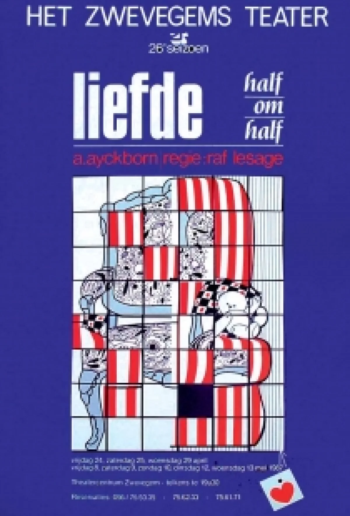 Komisch theater met drie echtparen in twee verschillende woonkamers die simultaan in éénzelfde decorruimte over scène dartelen, zonder elkaar te horen of te zien, maar elk met hun eigen huiselijke probleempjes en liefdesperikelen. Met onverwachte, knotsgekke situaties en een sprankelende dialoog zorgt Alan Ayckbourn met 'Liefde half om half' voor een aangenaam opgemaakt blijspel met de nodige misverstanden en hilariteit.